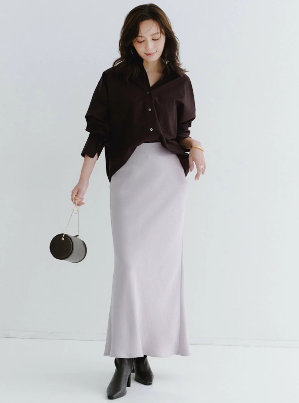 高級感のあるサテン生地と、落ち感のあるシルエットがストレートの体型をきれいに魅せてくれます。