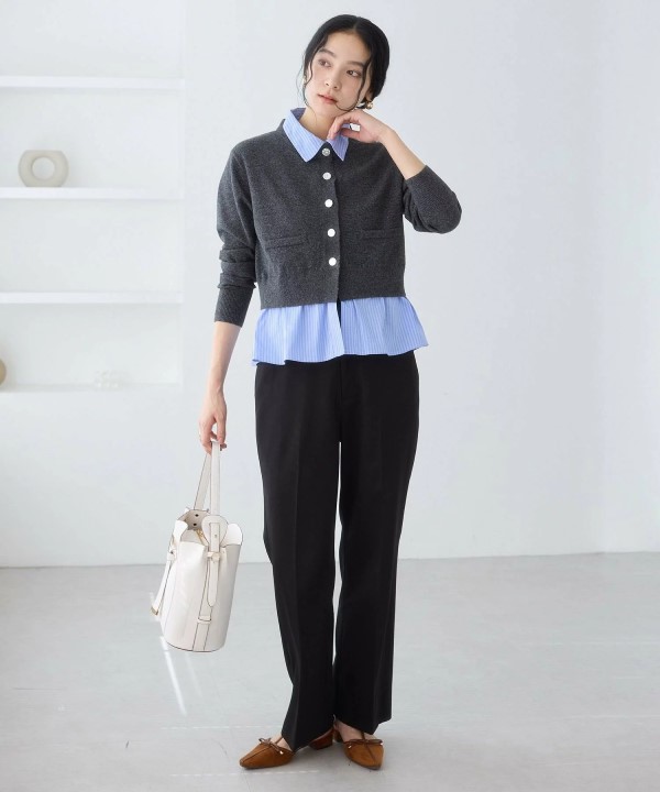 ショート丈カーディガン×シャツのレイヤード風トップスを主役にしたコーデが、骨格ウェーブの体型にマッチ!