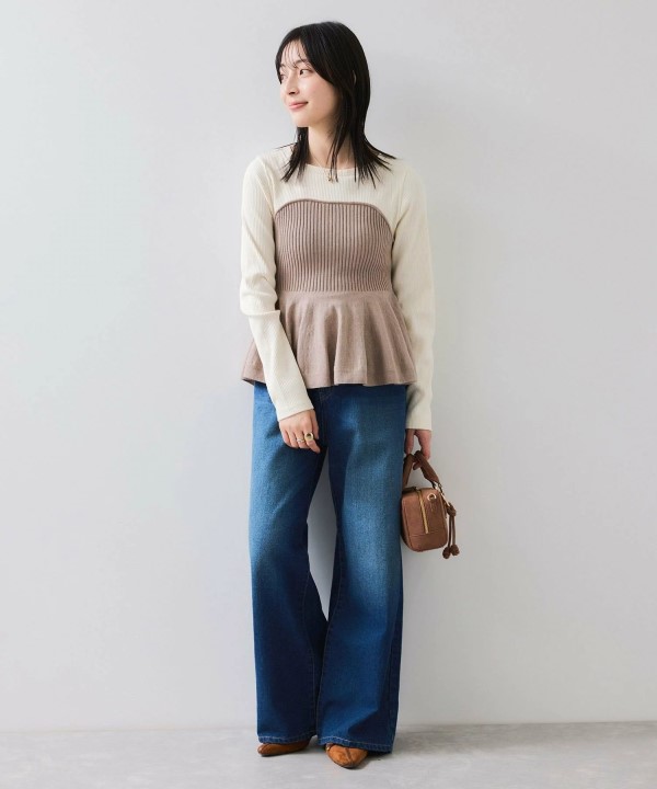 ワイドなデニムを合わせるときは、高い位置に切り替えのあるペプラムトップスで下重心を補正するとスタイルアップ!