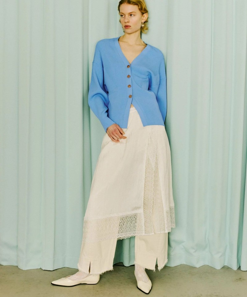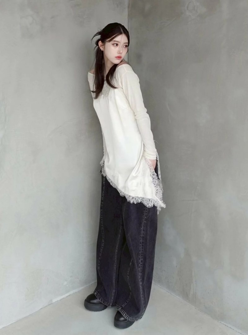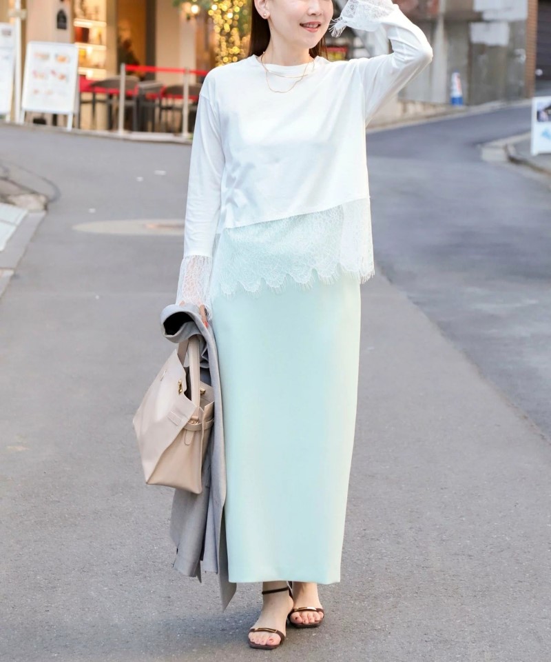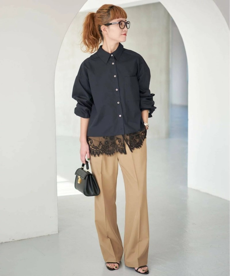 シャツにレースがドッキングしたトップスを主役にしたコーデがおすすめです。